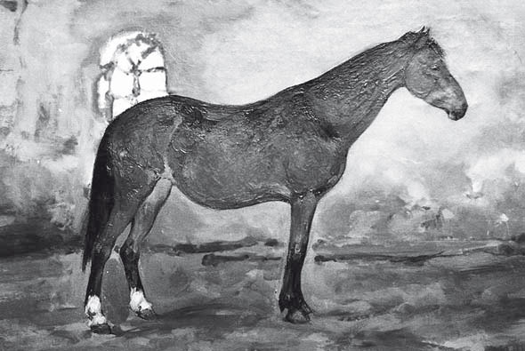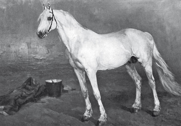 Первая была рыжей масти, хвост и грива несколько светлее. Рост не менее четырех вершков. Назвать Первую простой кобылой было нельзя, но она решительно ничем не привлекала к себе, и даже знаток едва ли угадал бы в ней знаменитую заводскую матку. Голова Первой была приятна и только, шея тонка, но маловыразительна, спина недурна, зад немного спущен. Костяк у кобылы был небогатый. Особой глубиной она не отличалась. Полагаю, что спартанское воспитание отразилось на ее экстерьере и развитии. Фотографии Первой не сохранилось, но существует ее портрет кисти Самокиша. В 1914 году у меня было довольно туго с кормами и несколько старых кобыл я отправил в херсонское имение брата. Среди них находилась и Первая. В это время у брата гостил Самокиш, и я просил его написать для меня картину. Самокиш изобразил старых кобыл в конюшне, у яслей с сеном. На переднем плане стоит старуха Вьюга, внучка Бережливого, а налево в углу – Первая, которую конюх вывел для чистки. Это единственное известное мне изображение Первой, бабки знаменитого Перезвона.