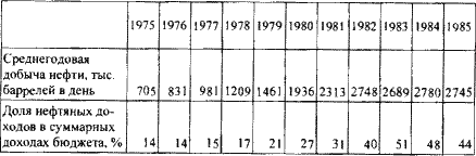 Скачок цен на нефть в 1973–1974 гг., совпал с открытием новых крупных месторождений в Мексике. Со второй половины 1970-х годов резко растут и объемы добычи нефти, и связанные с ними доходы бюджета (см. табл. 3.9). К 1970 г. нефтяной сектор производил 2,5% ВВП Мексики и обеспечивал федеральному правительству 3,5% его доходов. К 1983 г. доля этого сектора в ВВП возросла до 14%.[207] В 1974 г. доля нефти в доходах от внешней торговли Мексики составляла примерно 0,5%, в 1980 г. нефть и газ обеспечивали уже 67,3% экспортных поступлений страны. Доля обрабатывающих отраслей в экспорте сократилась до 16,5%.[208]