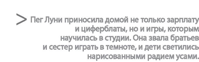 Атмосфера была настолько приятной, что Пег Луни полюбила эту работу и напрочь забыла про свои амбиции стать школьной учительницей. Она была крайне добросовестной и даже забирала циферблаты с собой, чтобы их раскрасить, аккуратно обводя цифры в тесном доме рядом с железной дорогой, где жила вся ее большая семья.