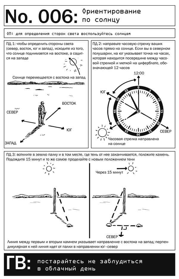 Если спутниковое слежение, которое стало неотъемлемой частью современной жизни, появилось всего полвека назад, то небесными объектами в качестве навигационных инструментов люди пользуются уже тысячи лет. Если вы изучили карту и в целом разобрались с особенностями местности, то сможете найти путь к безопасному месту при помощи ближайшей к нам звезды — Солнца. Просто понаблюдайте за его движением.