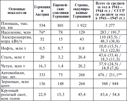 Основные показатели экономического потенциала Германии (годовое производство в середине 1941 года) и СССР (годовое производство в конце 1940 года)[81]