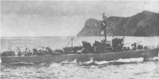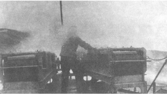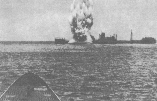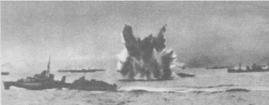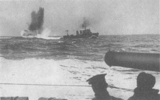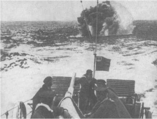 Сторожевой катер типа «МО» атакует глубинными бомбами предполагаемое местонахождение вражеской подводной лодки