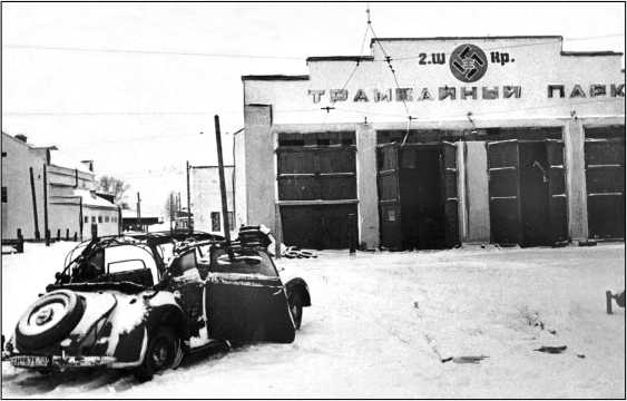 В помещениях калининского трамвайного парка в период оккупации размещались немецкие гаражи и ремонтные мастерские. Фото сделано сразу после освобождения города.