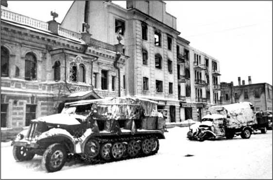 Брошенная техника вермахта на Красноармейской (сейчас Новоторжской) улице. На переднем плане 8-тонный полугусеничный тягач SdKfz.7.