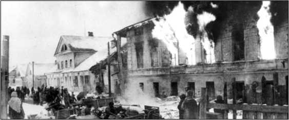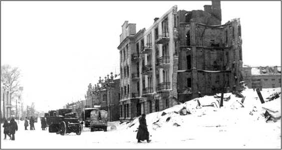 Здание на набережной реки Тьмаки, подожженное оккупантами перед отступлением.