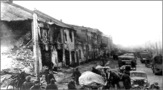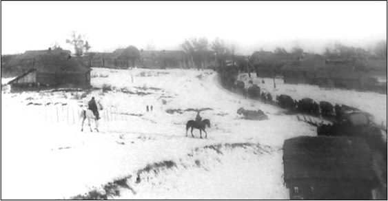 Тыловые колонны 129-й пд движутся по сельской местности после выхода из города.