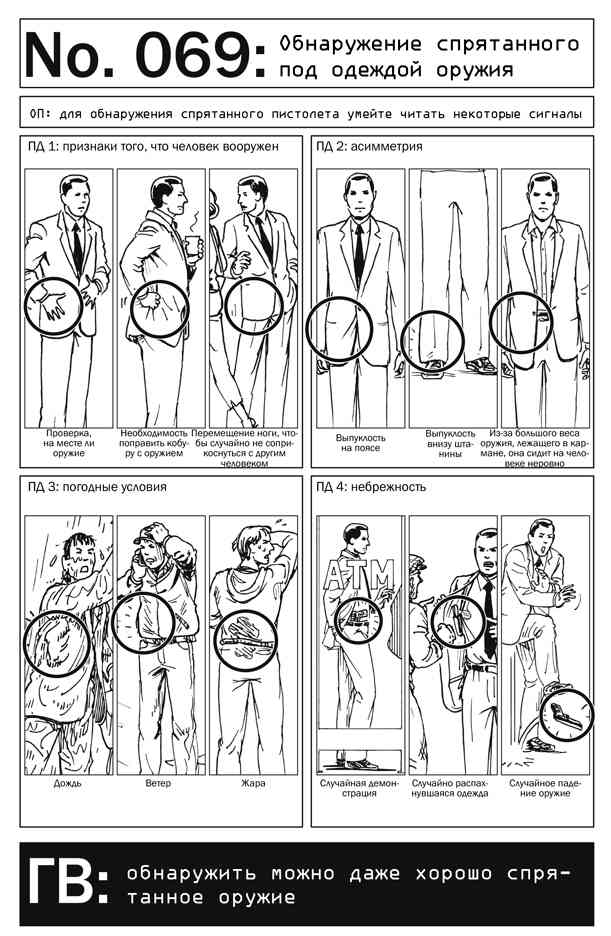 Асимметрия. Еще одним верным признаком наличия оружия является асимметрия в одежде. Пистолеты тяжелы и громоздки, и поэтому любой внимательный человек может, если присмотрится получше, заметить признаки их присутствия. Если кобура закреплена на поясе, в этом месте может быть заметная выпуклость; кобура на лодыжке приводит к появлению выпуклости или натяжению ткани в нижней части штанины. Пистолет, находящийся в кармане пиджака, своим весом будет немного оттягивать эту сторону, из-за чего пиджак будет слегка перекошен.