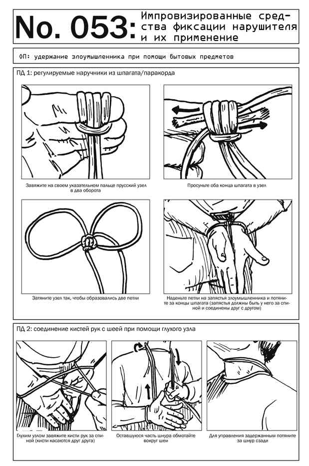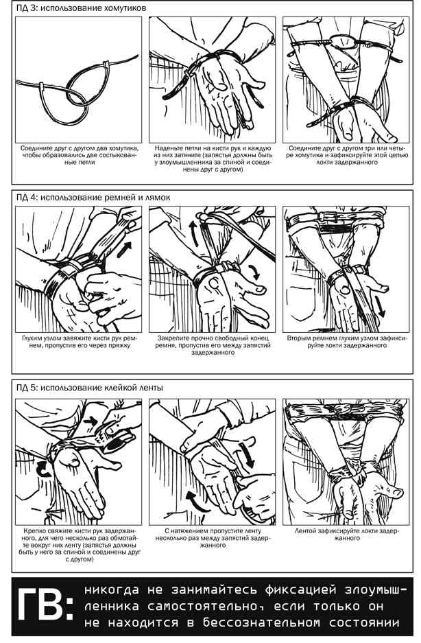 Если ситуация требует применения таких средств, всегда связывайте руки злоумышленника за спиной, тыльными сторонами ладоней друг к другу: так ему будет гораздо труднее развязать веревку и освободиться. Вяжите его как можно крепче, не задумываясь о том, насколько это неприятно или даже больно. Его комфорт в данный момент не ваша забота! Если вы предоставите ему хотя бы малейшую возможность для побега, он тут же ею воспользуется и при этом может ранить и вас, и ваших близких.