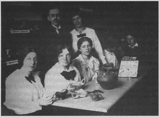 В Археологічному музеї Київських вищих жіночих курсів. Майбутня археологиня В. Козловська — сидить, четверта зліва. Викладач — В. Данилевич. 27 травня 1915 року