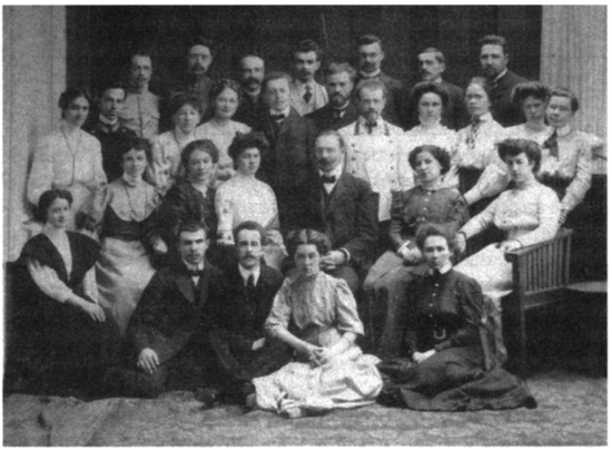 Київські курсистки та студенти — учасниці й учасники семінарію російської філології професора В. Перетца (у центрі). Варвара Адріанова-Перетц сидить перша праворуч у другому ряду. Близько 1907 року