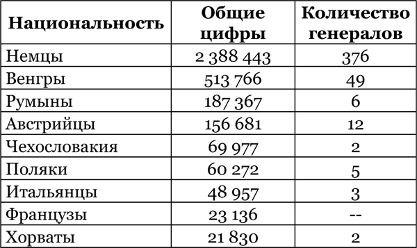 В целях усиления вермахта после покорения Европы были мобилизованы свыше 1 млн. 800 тыс. человек. Из них было сформировано 59 дивизий, 23 бригады, несколько отдельных полков, легионов и батальонов. При этом в войсках СС было 26 добровольческих дивизий, в которых служили албанцы, голландцы, датчане, венгры, бельгийцы, французы, латыши литовцы, эстонцы, украинцы и др. Все эти соединения входили в состав вермахта, и их потери учитывались, но историки все еще сомневаются в их точности. Очевидно, что фальсификацией по умолчанию является и сокрытие того факта, что с первых дней Великой Отечественной Германия имела в составе своих войск десятки дивизий своих союзников, а СССР все 1418 дней противостоял им в одиночку. Поэтому не удивительно, что военные потери самих немецких войск за весь период войны составляют 85,5 % командного состава, а 14,2 % (1 млн. 468,2 тыс.) – хоть и не вполне точные, но потери союзников. Потери же СССР – 99,3 %, на союзников приходится – 0,7 %.