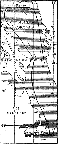 Судьба айсбергов различна. Одни уже вскоре после начала дрейфа оказываются на прибрежных мелях, другие в течение многих месяцев совершают зачастую весьма замысловатые переходы. Подгоняемые западногренландскими ветрами, они движутся на север, достигают залива Мелвилл, и там зимуют. Затем лабрадорское течение уносит айсберги в обратном направлении на юг. Пройдя вдоль восточных берегов Баффиновой земли и миновав Ньюфаундленд, они достигают районов рыболовных промыслов Большой ньюфаундлендской банки. Этот путь длиной примерно в две тысячи миль айсберг проходит в течение двух лет.