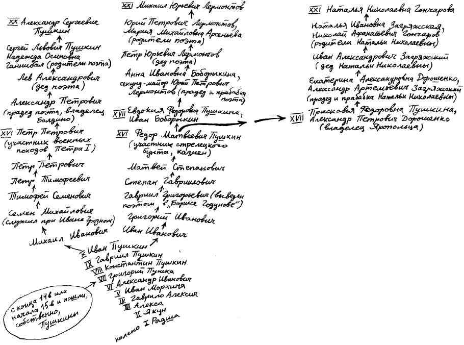 А. А. Черкашин согласился с нами, а вернее, с Александром Александровичем Григоровым и академиком Веселовским, внес поправку в свою таблицу: Пушкин десятиюродный дядя Лермонтова. Внес в свою таблицу и наши личные изыскания: Лермонтов и Наталья Николаевна пятиюродные брат и сестра.