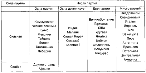 Причину такого положения вещей следует искать в различных формах адаптации, характерных для многопартийных систем, и в различиях между теми формами, в которых там выражается сила партий. В многопартийных системах сильные партии обычно более сплоченны и сложнее организованы, но в то же время менее гибки и менее автономны, чем сильные партии в двухпартийных системах. В сильных многопартийных системах существует тенденция к однозначному соответствию между социальными силами и политическими партиями. Профсоюзы, бизнес, землевладельцы, городской средний класс, церковь — все эти силы имеют собственных политических представителей, а для достижения компромисса и адаптации вырабатываются особые институционные средства. Сильная система такого вида может существовать только при высоком уровне мобилизации и политической активности. Если этого нет, социальные силы, активно проявляющиеся в политике, ограничены, и нет социальной базы для сильной многопартийной системы. Те многопартийные системы, что существуют в подобных обстоятельствах, обычно отражают многообразие клик и семей в рамках ограниченной элиты. Слабая институциализация и узкая социальная база делает такие системы в высшей степени хрупкими. Таким образом, шаг от многопартийности к полному отсутствию партий оказывается столь же легким, как шаг в противоположном направлении. То есть отсутствие партий и многопартийность сходны в отношении своей институционной слабости.