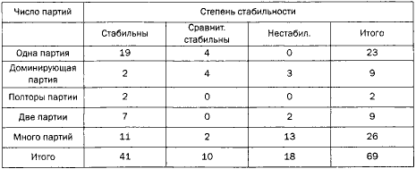 В глобальном масштабе похоже на то, что сколько-нибудь существенной связи нет. Как видно из таблицы 7.2, сильные партии, как и слабые, могут существовать в любом варианте системы с точки зрения численности составляющих ее партий. Огрубленная классификация, сделанная на основе этой таблицы, по-видимому, подтверждается таблицей 7.3, которой Банкс и Текстер иллюстрируют связь стабильности партийной системы с числом в ней партий. Отсутствие нестабильных однопартийных систем может быть скорректировано, если принять во внимание африканские государства, где в 1960-х гг. произошли военные перевороты.