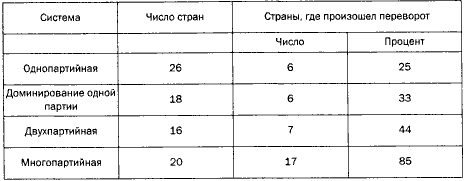 В модернизирующихся странах однопартийная система проявляет большую стабильность, чем плюралистическая. В таких странах, например, многопартийная система более уязвима для вмешательства военных, чем система однопартийная или системы с доминированием одной партии и с двумя партиями. В 1965–1966 гг. во многих африканских странах действительно произошли военные перевороты, однако это не меняет общей картины обратной связи между числом партий и стабильностью системы. Как показывают данные таблицы 7.4 на 1966 г., однопартийные модернизирующиеся страны были наименее, а страны многопартийные наиболее склонны к военным переворотам. Конечно, и однопартийная система не застрахована от военного переворота, но многопартийной такие перевороты почти гарантированы. Все исключения связаны либо с промежуточными типами системы (Марокко, где в 1965 г. произошел переворот в пользу королевской власти), либо это страны с высокоевропеизированным населением (Израиль, Чили), где недавняя или старая иммиграция плюс историческая традиция способствовали воспроизведению более стабильных образцов многопартийной системы, характерных для континентальной Европы.