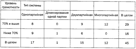 Один из приблизительных показателей адаптивной способности партийной системы — средний возраст составляющих ее партий. Чем он выше, тем, предположительно, выше институциализация системы и ее стабильность. В целом средний возраст главных партий в многопартийной системе, конечно, ниже, чем в одно- или двухпартийной. Можно, однако, сравнить формы, которые принимает партийная институциализация высокого уровня в модернизирующихся и модернизированных странах. Приблизительную границу между первыми и вторыми можно провести, используя критерий уровня грамотности. Граница проходит на уровне 70% грамотности взрослого населения. Среди 29 стран с высоким уровнем грамотности и старыми партиями (возраст главных партий 30 лет на 1965 г.) не было преобладания какого-то одного типа системы. В обществах с высоким уровнем грамотности высокоинституциализованная партийная система может иметь самые разные формы. В противоположность этому, 10 из 16 стран с низким уровнем грамотности и высокоинституциализованной партийной системой имели однопартийную систему или систему с доминированием одной партии. 6 имели двухпартийную систему и ни одна — многопартийную. Вновь проявляется то правило, что многопартийная система в модернизирующейся стране несовместима с высоким уровнем политической институциализации и стабильности. В таких странах многопартийная система — значит слабая система.