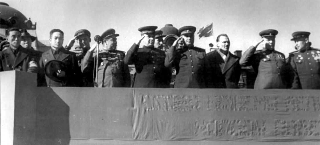 Парад Советских войск по случаю разгрома японской Квантун-ской армии. В центре на трибуне – командующий легендарной 6-й гвардейской танковой армией дважды Герой Советского Союза генерал-полковник танковых войск А. Г. Кравченко. Сентябрь 1945 г., Мукден