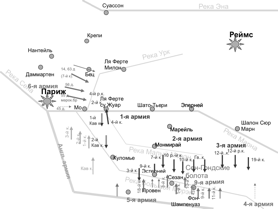 Обращает внимание большое количество «особых точек позиции. В сущности, ими оказываются все переправы на Марне, Дамартен, Париж. Да, строго говоря, и все остальные пункты, обозначенные на схемах, мы вправе рассматривать как узлы позиции, переход которых из рук в руки серьезно меняет оперативную обстановку. Столь большое количество точек связности объясняется отчасти начертанием французской дорожной сети и особенностями протекания рек в районах боевых действий, с другой – крайней неустойчивостью положения германских армий Правого крыла и очень высоким риском мгновенного проигрыша войны для французов.