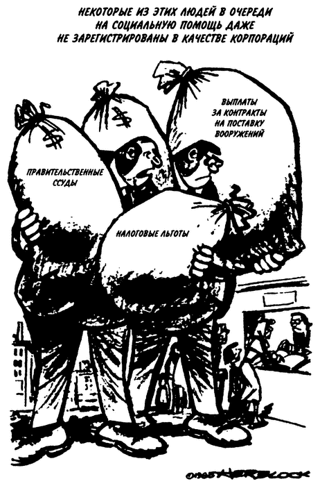 Правительство сдает в аренду или продает на миллиарды долларов нефти, угля и минеральных ресурсов по ценам, составляющим часть реальной рыночной стоимости. Оно теряет сотни миллионов долларов, не собирая арендные платежи и лицензионные отчисления, процентные выплаты и штрафные санкции с гигантских нефтяных компаний. Правительство без необходимости выплачивает огромные суммы процентных ставок по займам и кредитам. Оно оставляет миллиарды долларов государственных средств на счетах в частных банках, не взимая за это процентных отчислений. Оно терпит завышение цен со стороны компаний, с которыми сотрудничает, предоставляет крупным компаниям долгосрочные кредиты и тарифную защиту. Правительство выплачивает миллиарды долларов в качестве компенсации расходов по слиянию крупным корпорациям, на которых размещает военные заказы. Правительство бесплатно раздает частоты для радио- и телевещания на сумму $37 миллиардов вместо того, чтобы сдавать их в аренду или продавать с аукциона. Этот объем частот для телерадиовещания почти в пять раз превышает объем частот, который крупные вещательные и телевизионные сети контролировали ранее[152].