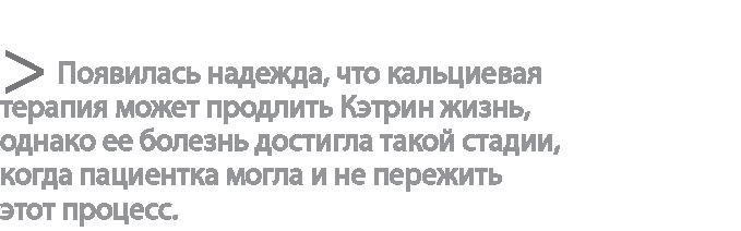 Хотя кальциевая терапия и была для нее невозможна, Кэтрин все равно отказывалась сдаваться. «Я надеюсь на чудо, – говорила она. – Я молюсь о нем. Я хочу бороться за жизнь и оттянуть неизбежный конец ради моего мужа и детей». Маму Кэтрин потеряла в шесть лет; она знала, каково это – расти без матери, и была решительно настроена не допустить, чтобы ее собственные дети повторили ее участь.