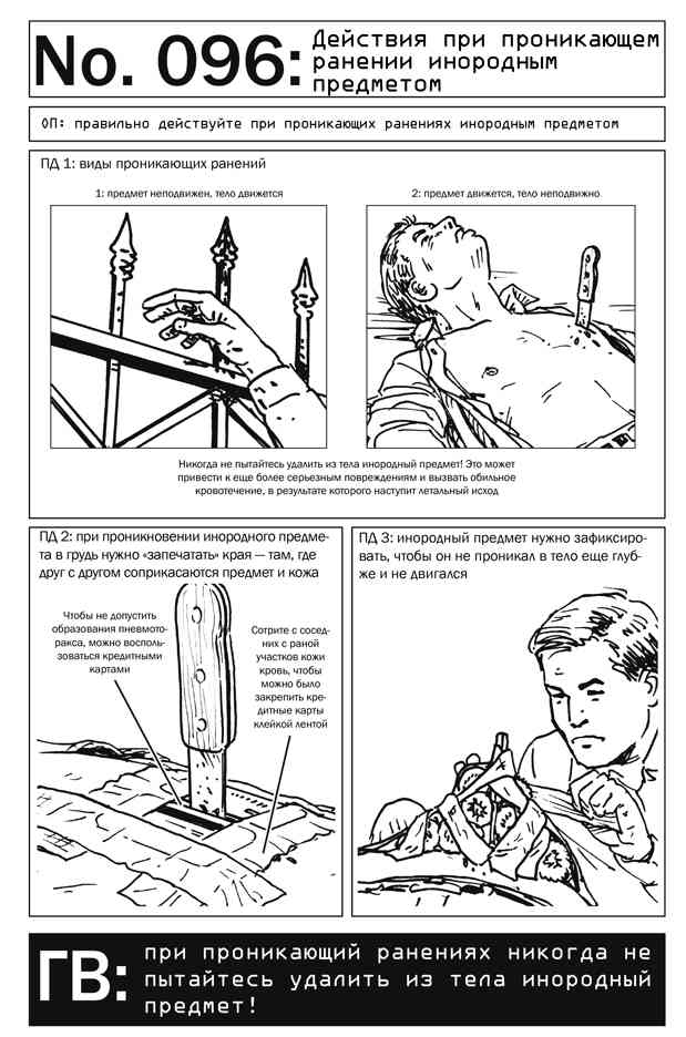 Если инородный предмет находится поблизости от грудной полости, лучшее, что можно сделать, — это позвонить в службу спасения 911 и закрыть рану, чтобы в нее не попадал воздух. При повреждении груди существует риск прокола легкого и возникновения пневмоторакса, что опасно для жизни пострадавшего. Воздух, поступающий в полость грудной клетки через рану, давит на легкие, из-за чего раненый не может нормально дышать. С каждым вдохом такого воздуха становится больше, что в конечном итоге приводит к снижению жизненной емкости легких. Чтобы предотвратить попадание воздуха в область раны, можно закрыть ее подручными средствами, в частности кредитной картой, которую следует закрепить на теле при помощи клейкой ленты (см. раздел 095).