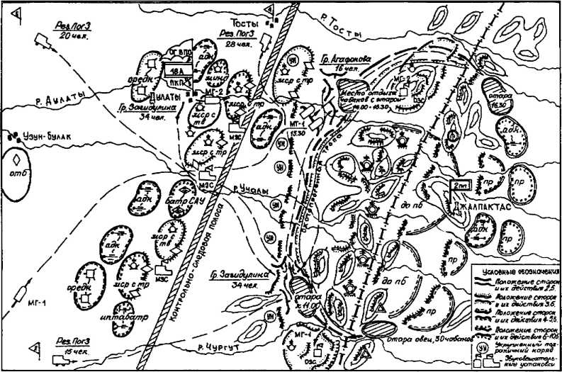 6 мая маневренная группа после совершения 200-километрового марша вышла и закрепилась на высотах непосредственно у линии границы на левом фланге дулатинской группировки. В ее составе находились две заставы и две мотострелковые роты. Командовал мангруппой подполковник Н.З. Иващенко. На первом этапе (до переформирования маневренных групп) в ней отсутствовал штатный заместитель начальника по политчасти, его обязанности исполнял старший инструктор политотдела отряда капитан В.Я. Горбачев. Здесь же находились комсомольские работники политотдела отряда. В мотострелковых ротах и на заставах мангруппы должности заместителей по политчасти были укомплектованы, только на одной заставе должность замполита оставалась вакантной.