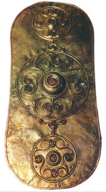 Щит из бронзы, найденный в Тамиджи, Ботерси (I в. до н. э.). Декор представлен центральным орнаментом из роз и двумя аналогичными орнаментами, но меньшего размера вверху и внизу. Центр каждого орнамента инкрустирован красной смальтой, окруженной симметричными волютами. Этот предмет показывает высокое мастерство кельтских ремесленников, которые как «люди искусства» занимали достаточно высокое общественное положение сразу после военных.