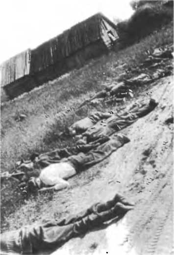 „…коммунистические провокаторы приступили к делу. Провокаторы выслеживали одного или двух немцев, зверски убивали их, замораживали, придавая издевательскую форму трупу (например, в виде отдающего честь по эсэсовски, вытянутой вперед рукой, ладонью наружу и т. п.), и ставили этот труп на перекрестке дорог. Обнаружив его, немцы вызывали карательный отряд и начинали расправу с ближайшими селами: расстреливали, сжигали людей в их хатах, уводили скот, опустошали окрестности. Весть о случившемся молниеносно разносилась по районам с помощью тех же советских организаторов и агентов.