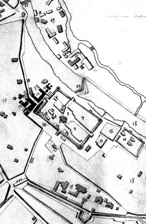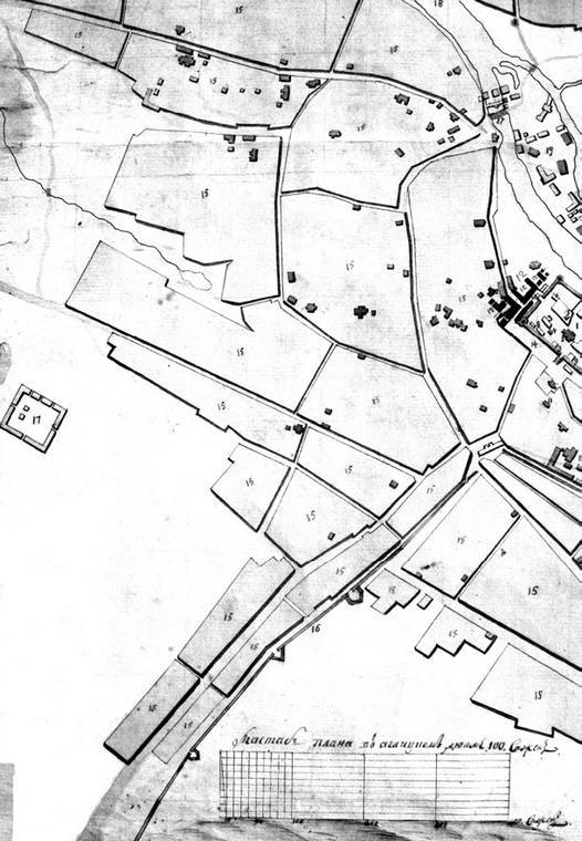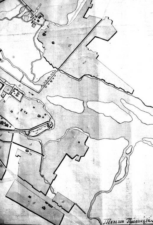 Мы не видим центральной улицы Киевской. Да и вообще все кончается ул. Каминского. Видимо тут и была Киевская застава и ямская слобода, крайний случай на ул. Пушкинской, потом по Генплану 1779 г. Граница города, Киевская Застава и Ямская слобода были перенесены на ул. Л.Толстого. Обращает на себя внимание ров и укрепленный вал, идущий от Упы, речки Хомутовки и до Малиновой засеки. Но укрепленный вал от Киевской до Оружейного завода уже срыт и на плане не указан. Хорошо видно, что дома Левинцова, Лугинина и правее два дома ул. Советская д.55 и ул. Менделеевская д.3 уже стояли. Но нет дома Левинцова на ул. Дзержинского, зато рядом с домом Лугинина стоит нам неизвестный большой дом. Также ещё не построен дом на ныне по ул. Братьев Жабровых д. 1. На территории мужского монастыря мы видим 2 церкви, до нас дошла информация только об одной Ивановской. На плане отсутствует Никитская церковь, на плане части Тулы 1740 г. Никитская церковь стояла у моста в Заречье. На Старо-Павшинской (Мосина) мы не видим д. № 55, где сейчас туберкулезный диспансер, но есть утраченный комплекс домов между церквями.