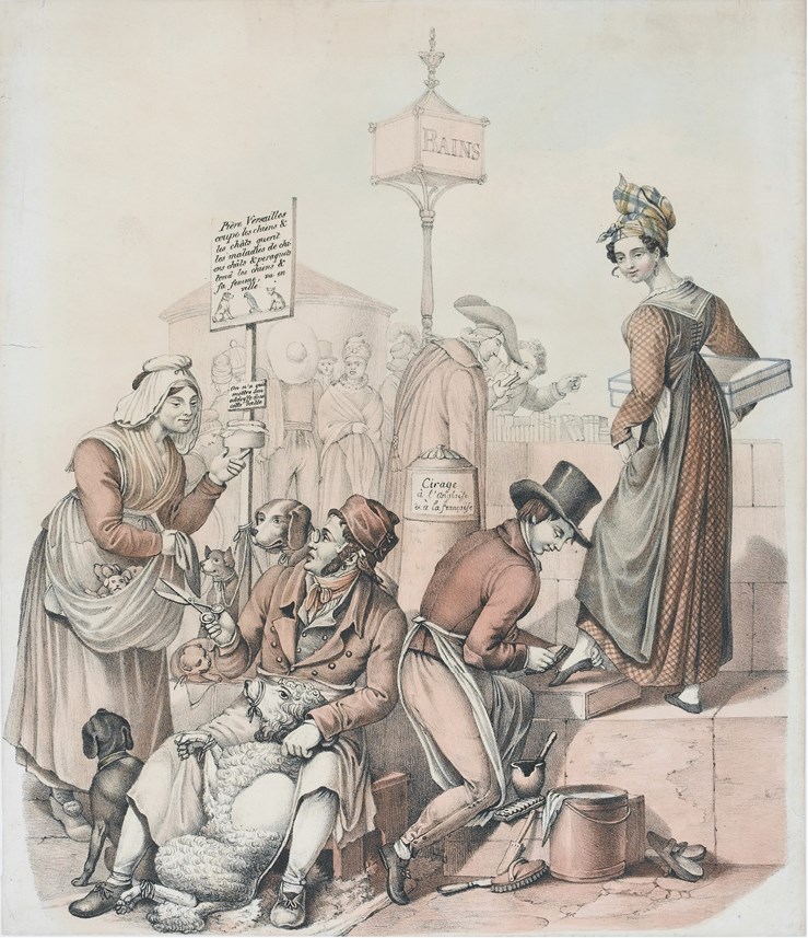 4. Уличные торговцы на набережной Сены в Париже: парикмахер домашних животных, чистильщик обуви и книготорговец. Начало XIX в. Библиотека Веллкома, Лондон