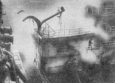 Искра, вызвавшая пожар, возникла, вероятно, от электродуги в воздухоподогревателе, который работал на причале вместо вышедшего из строя парового воздухоподогревателя. От момента падения рукава до момента вспышки прошло менее одной минуты.