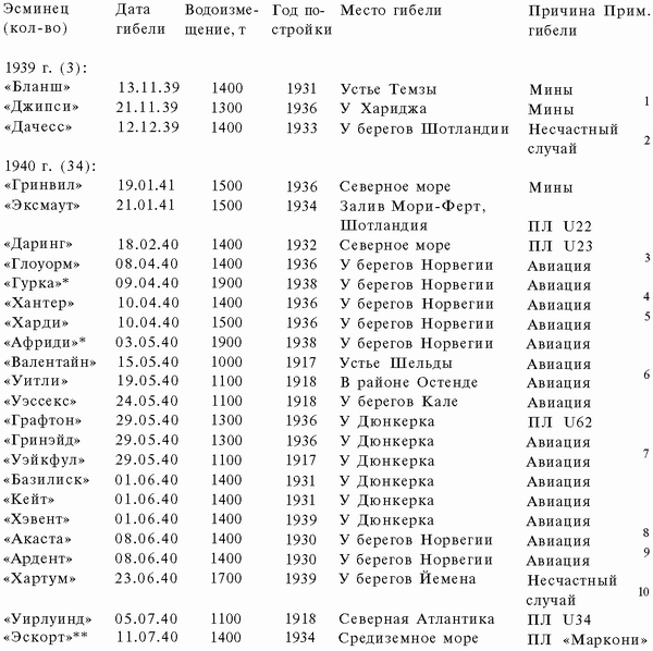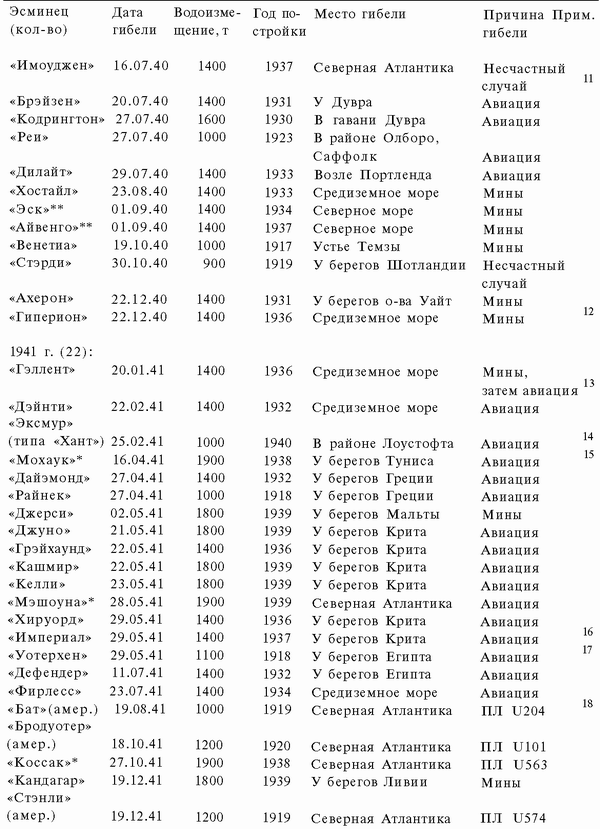 ПОТЕРИ СРЕДИ АНГЛИЙСКИХ ЭСМИНЦЕВ БЫЛИ ЗНАЧИТЕЛЬНЫМИ. В НИЖЕСЛЕДУЮЩЕЙ ТАБЛИЦЕ ПРИВЕДЕН ПЕРЕЧЕНЬ АНГЛИЙСКИХ ЭСМИНЦЕВ, ПОГИБШИХ В ПЕРИОД С НОЯБРЯ 1939 ГОДА ПО ДЕКАБРЬ 1941 ГОДА[245]