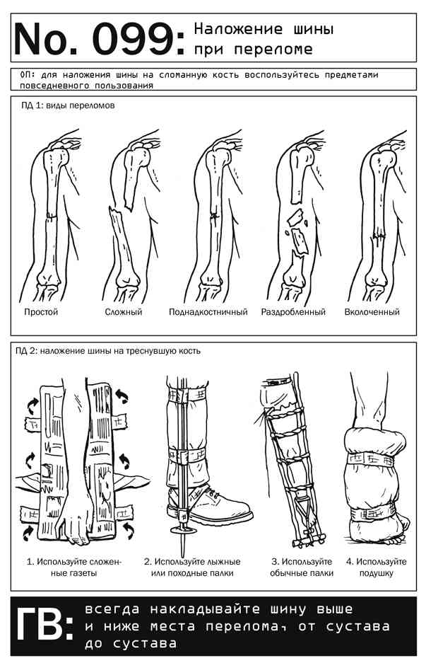 В качестве временной шины можно использовать самые разные подручные средства, в том числе сложенные несколько раз газеты, лыжи, походные и обычные палки и даже подушки. После того как вы при помощи шины выровняете конечность, дополнительно зафиксируйте место повреждения пластырем или привяжите конечность к телу: руки должны быть прижаты к туловищу, ноги — друг к другу.