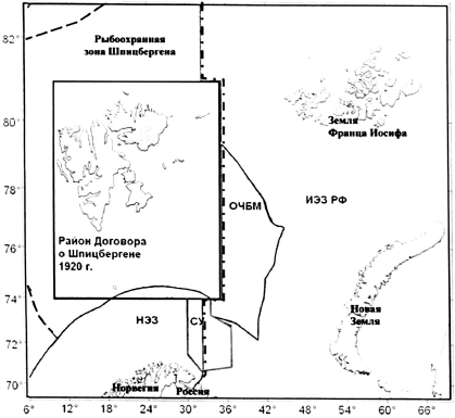 В целом все же в советский период с введением в Баренцево море 200-мильной экономической зоны вдоль континентального побережья СССР и Норвегии, достижение договоренностей по временному режиму рыболовства в смежном участке, наличием морского района попадающего под действие Договора о Шпицбергене и 200-мильной рыбоохранной зоны Норвегии вокруг архипелага Шпицберген, удалось гармонизировать некоторые меры рыболовства. Вместе с тем все это создало самый сложный в правовом отношении районы рыболовства Баренцева моря (рис. 3).