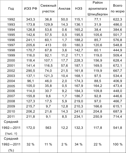 Тем не менее, достигнутый в годы холодной войны пакет договоренностей между Советским Союзом и Норвегией позволил избежать крупномасштабных конфликтов и конфронтации в области рыболовства. Более того, были приняты совместные меры по управлению запасами морских живых ресурсов Баренцева моря на основе скоординированных научных исследований двух стран, и созданы определенные меры доверия и механизмы для рассмотрения возникающих проблем, в частности СРНК. Весь этот комплекс мер позволил отечественному рыболовному флоту Северного и Западного бассейнов, несмотря на сложный правовой режим различных районов Баренцева моря, устойчиво осуществлять промысел по всей его акватории уже в условиях новой капиталистической России. Вылов нашего флота за последнее двадцатилетие (1992–2011 гг.) составил в средним 542 тыс. т в год, а в последние три года он колеблется от 615 до 714 тыс. т (табл. 4).