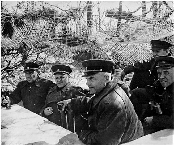 Командный пункт перед Зееловскими высотами. Апрель 1945 г. Слева направо: командующий 8-й гв. армией генерал-полковник В.И. Чуйков, член Военного совета фронта генерал-лейтенант К.Ф. Телегин, командующий артиллерией фронта генерал-лейтенант артиллерии В.И. Казаков