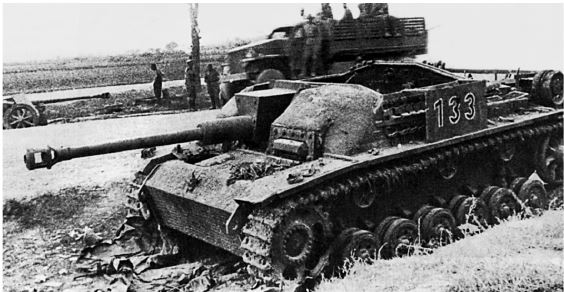 Подбитая САУ «Штурмгешюц» на подступах к Берлину. Крыша самоходки сорвана взрывом боекомплекта