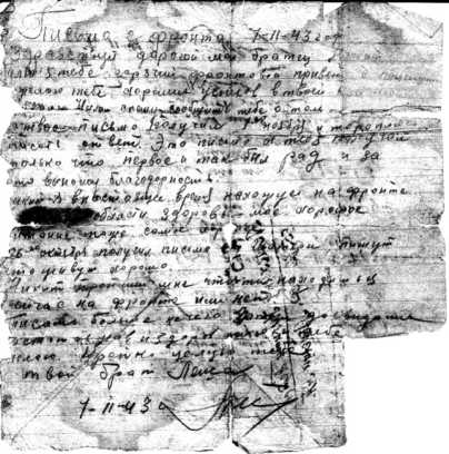 Остаюсь жив и здоров, чего и тебе желаю. Крепко целую тебя, твой брат Леша. 7-11-43 г.»