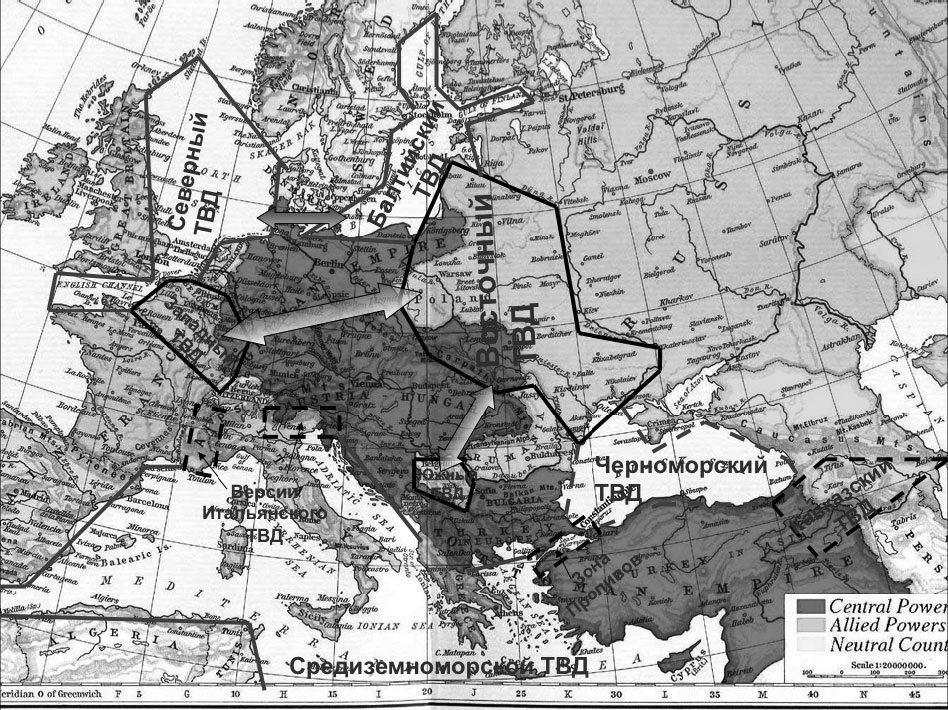 Потенциальными зонами военных действий могли и рано или поздно должны были стать западная или северная граница Италии (итальянский ТВД), а также территория Оттоманской империи. Последняя буквально генерировала самостоятельные ТВД – морские (Черное море и зона проливов) и континентальные – Кавказский, Суэцкий, Месопотамский.