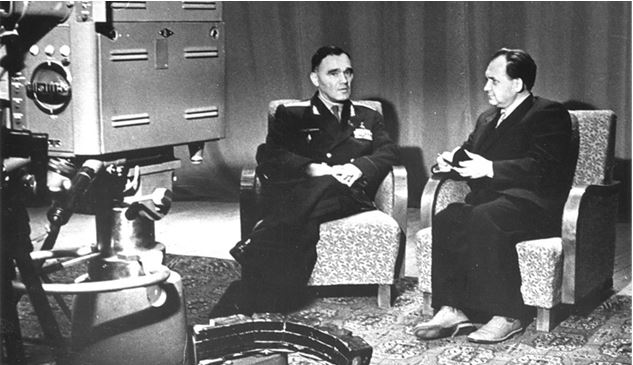 А.С. Яковлев и журналист Е.И. Рябчиков при записи телепередачи 26.07.1957 г. Архив ОАО «ОКБ им. А.С. Яковлева».
