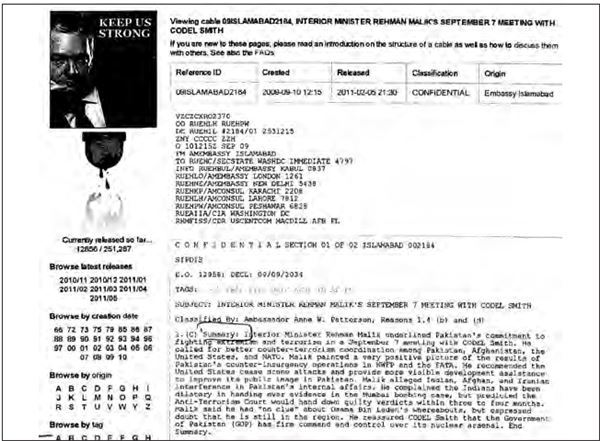 Этот документ, опубликованный порталом «WikiLeaks», является одной из тех нескольких тысяч секретных дипломатических телеграмм, которые предоставил данному сайту неизвестный сотрудник Государственного департамента США, и все они были выложены во всемирную сеть в ноябре – декабре 2010 года. Телеграмма, которую мы воспроизводим, представляет собой отчет о секретном совещании, состоявшемся 7 сентября 2009 года, в котором участвовали министр внутренних дел Пакистана Рехман Малик и представители американского посольства в Исламабаде. Они обсуждали антитеррористическую борьбу и преследование Усамы бен Ладена.