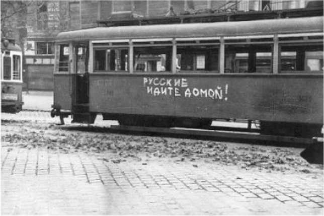 Будапешт конца октября 1956 г. Лозунг «Русские домой» на городском трамвае
