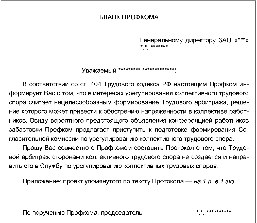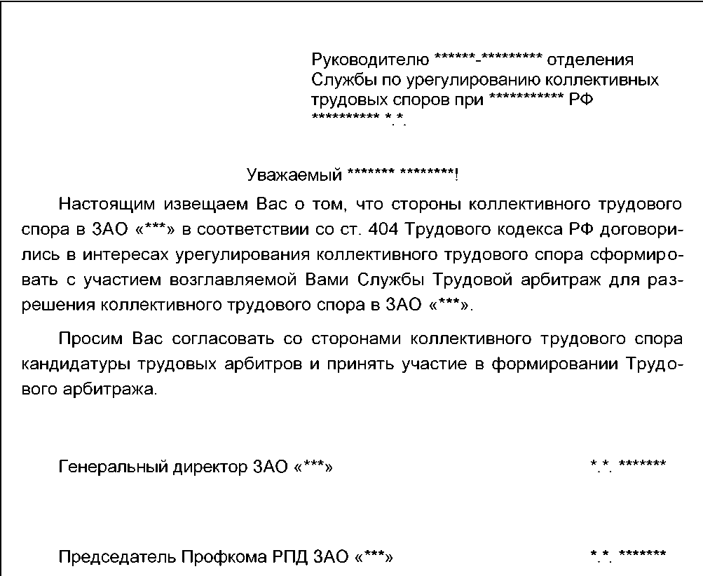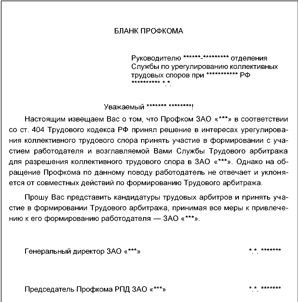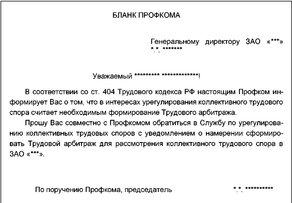 Обращение Профкома к работодателю с предложением сформировать, Трудовой арбитраж для урегулирования коллективного трудового спора