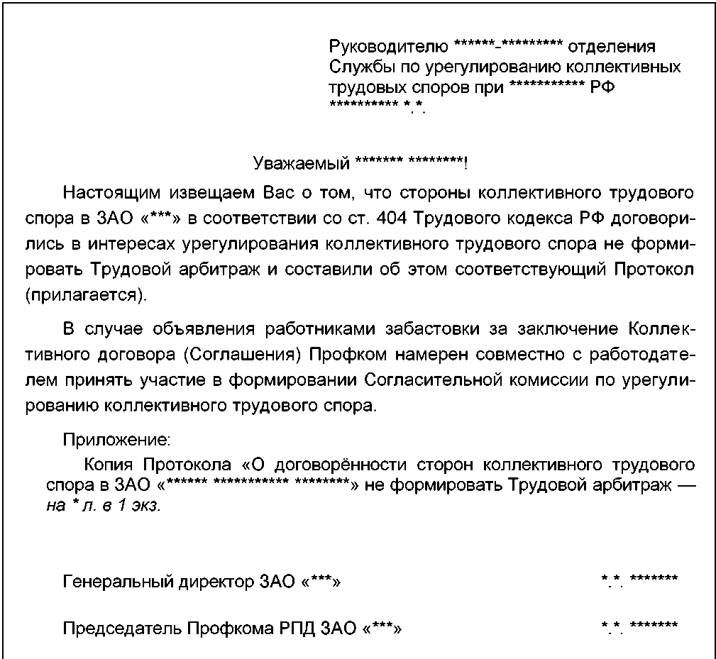 Обращение Профкома в Службу по урегулированию коллективных трудовых споров с информацией о том, что Трудовой арбитраж создаваться не будет