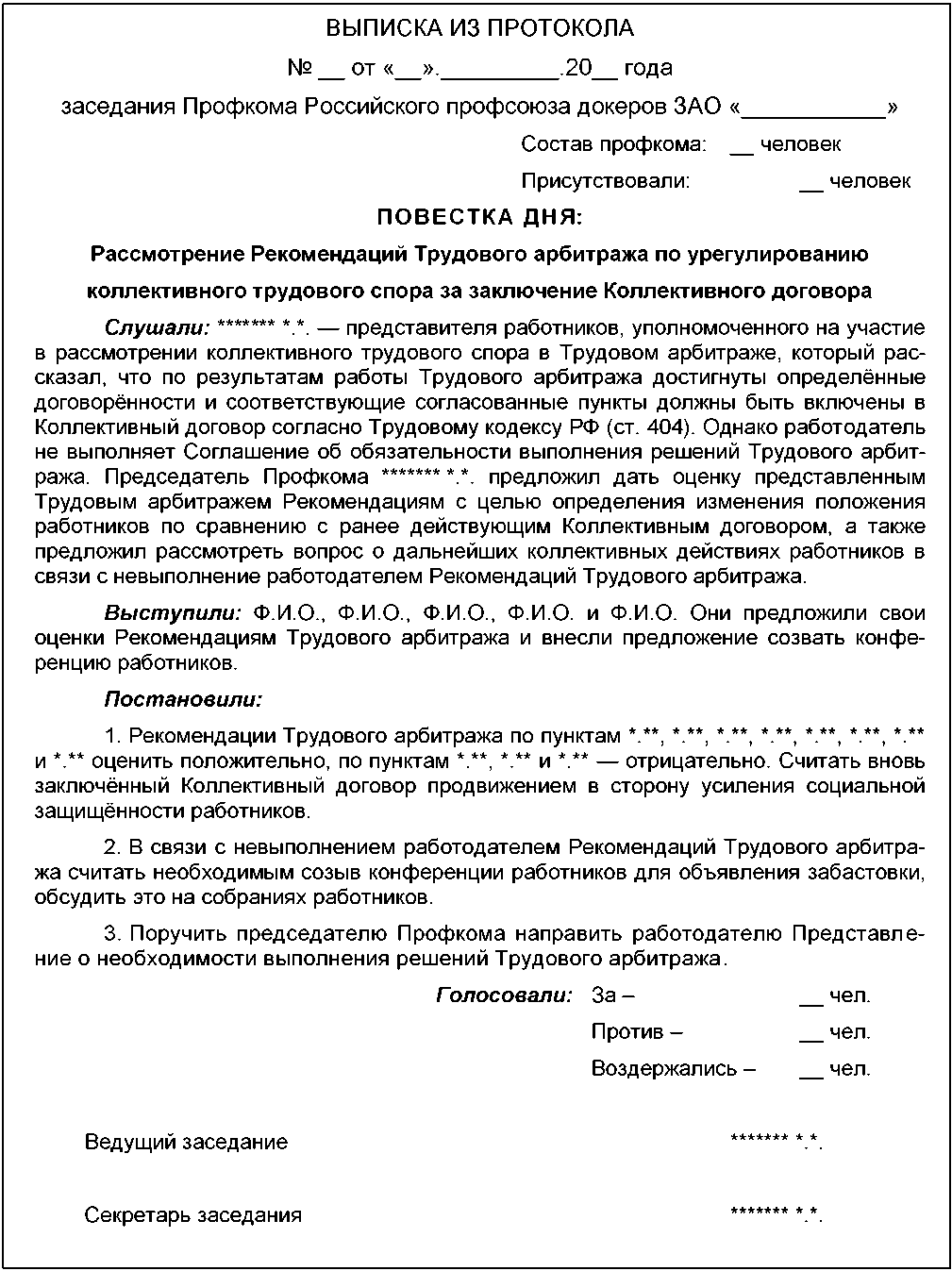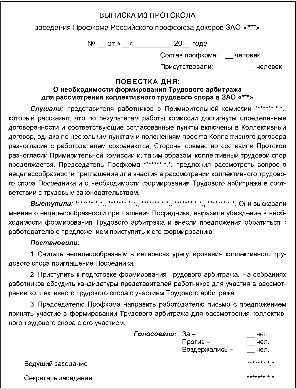 Выписка из Протокола заседания Профкома, принявшего решение обратиться к работодателю с предложением приступить к формированию Трудового арбитража