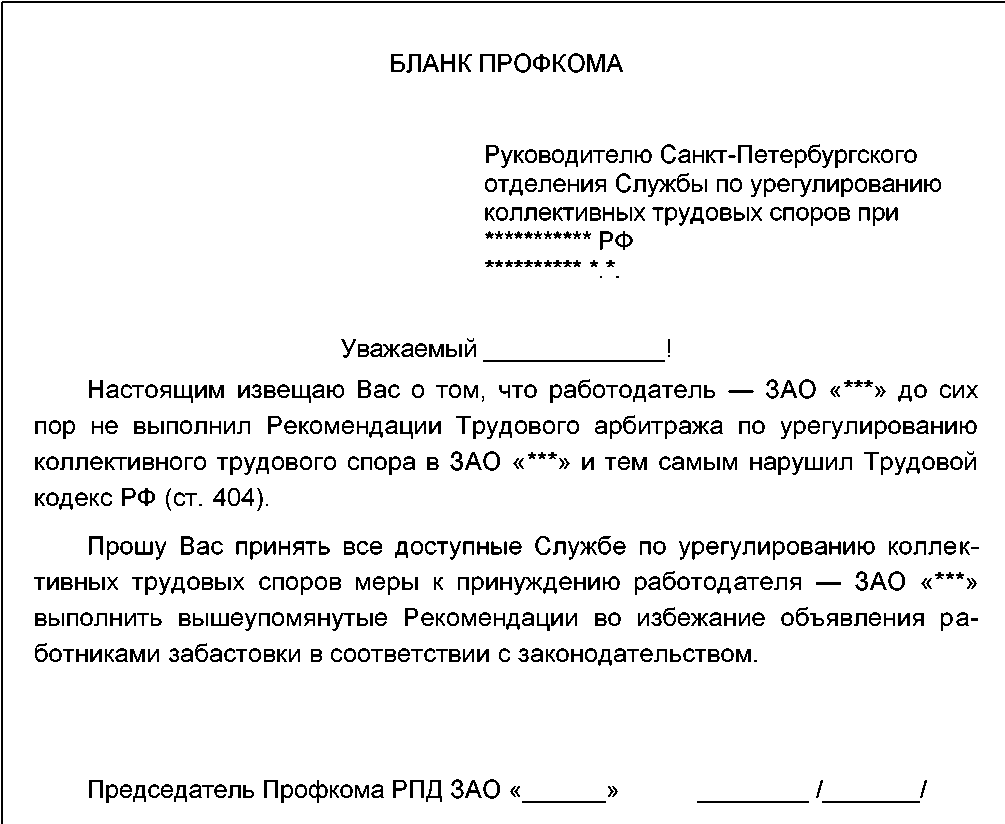 Обращение Профкома в Службу по урегулированию коллективных трудовых споров с просьбой о содействии в формировании Трудового арбитража ввиду уклонения работодателя от участия в его формировании