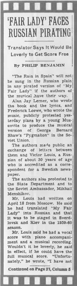 Переполох в западной прессе и первое появление имени В. Луи: «простой москвич в порядке акта свободного предпринимательства» похитил «Прекрасную леди». New York Times, май 1959 г.