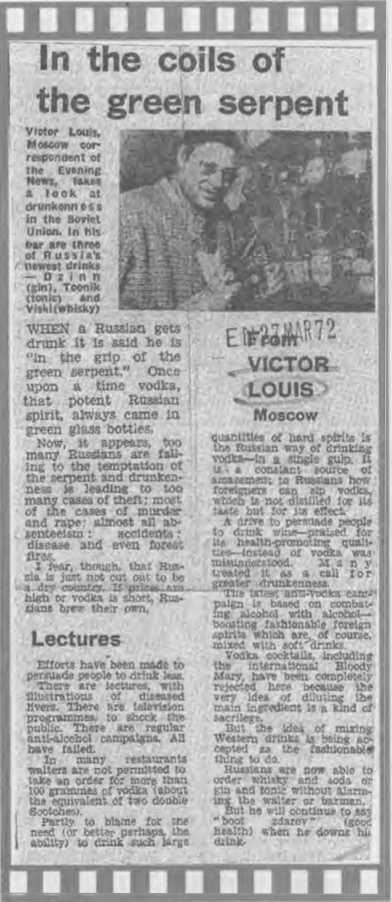 Одна из «гуманитарных» статей В. Луи в газете Evening News с заголовком: «В удушливых объятиях зелёного змия» о том, что нынче любят пить русские. Репортаж автора из «простого» московского бара с западными напитками, которые в СССР было не достать. Март 1972 г.