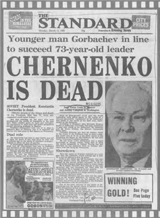 Умер Черненко. В. Луи первым сообщает о том, что следующий генсек — Горбачёв. Человек, который вскоре его, Луи, и «съест». Март 1985 г.